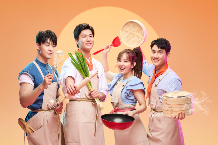 圖/WOW集團實境節目「菜鳥老闆來上工之快炒特工」主持群包括愛紗、風田(左2)、蘇洛洋(左1)、大軍(右1)。(WOW集團火種娛樂提供)